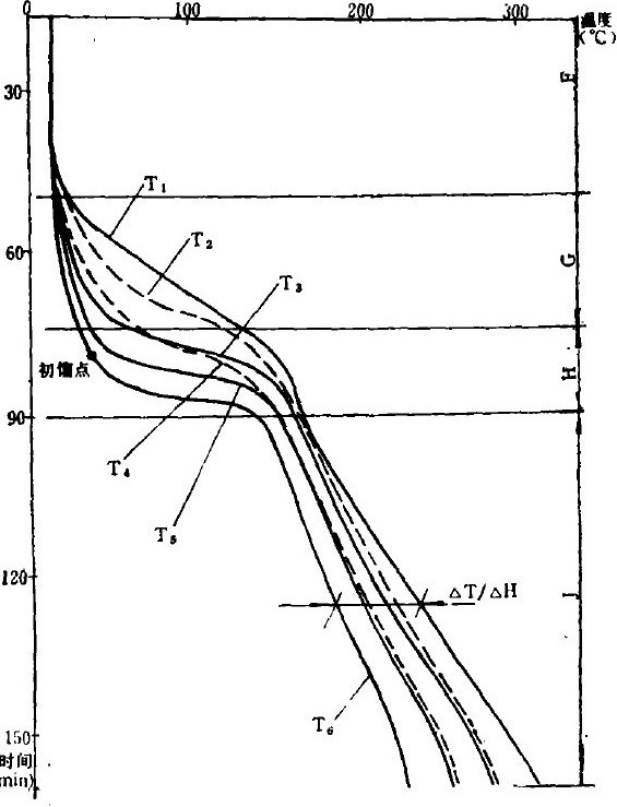 首先表現(xiàn)升溫趨向線性化,并具有很大的升溫速率。最遲表現(xiàn)升溫的線性化和升溫速率增l大,并且已到達(dá)初餾點(diǎn)之后。在蒸餾的操作過(guò)程中,在控制使T、達(dá)到ASTMD2892規(guī)定的允許界限溫度310℃時(shí),T1應(yīng)能同時(shí)達(dá)到或盡量接近常壓蒸餾的蒸餾界限溫度210℃。否則,繼續(xù)進(jìn)行的減壓蒸餾很難銜接,也易使餾分出現(xiàn)脫空。在蒸餾試驗(yàn)過(guò)程中,除了應(yīng)達(dá)到圖曲線的正常狀態(tài)外,容易因操作或試驗(yàn)儀而出現(xiàn)非正常的蒸餾狀態(tài)。開(kāi)始時(shí),對(duì)T2和T4的加熱控制調(diào)得過(guò)小,以致在圖相應(yīng)的G階段內(nèi)T2和T4高出T3和T5。不夠,不能誘使T3和TS較早地獲得升高,一旦柱內(nèi)油蒸氣貫通之后,又因T3和T6的迅速陡升而造成柱內(nèi)熱量損失,導(dǎo)致T6不能接近210℃蒸餾溫度限。造成這種非正常蒸餾狀態(tài)的原因是:塔臟,在蒸餾器內(nèi)積存油渣雜質(zhì)太多;原油含水量太高,柱外層保溫加熱控制不當(dāng);釜的加熱功率先是太大,后又減得太小或不連續(xù)。