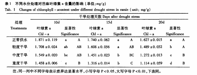 通過葉綠素測定儀的研究并分析表明,干旱脅迫10天、15天時輕度干旱與對照差異較小,不顯著,干旱脅迫20天時差異達顯著水平,表明干旱的持續(xù)時間對葉綠素a的含量影響較大,即使是輕度干旱脅迫,持續(xù)時間過長也顯著降低苧麻葉綠素a含量。各時間段中度干旱處理和中度干旱處理與對照之間的差異均達顯著或極顯著水平,表明干旱脅迫的程度對葉綠素a含量具有重要的影響,嚴重干旱脅迫在較短的時間內(nèi)也顯著降低葉綠素a含量。