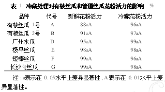 通過種子低溫低濕儲藏柜的研究,并結(jié)合表1,我們可以從中得知,冷藏處理沒有降低普通絲瓜花粉的活力,而有棱絲瓜花粉的活力略有上升,有棱絲瓜品種間、普通絲瓜品種間以及有棱絲瓜和葡萄絲瓜品種間新鮮花粉和冷藏花粉的活力差異均不顯著。冷藏處理有棱絲瓜花粉的活力略有上升,可能與采花朵的時間有關(guān),普通絲瓜是花開1h后采取的,而有棱絲瓜的新鮮花粉是花開后立即采取的,這就說明絲瓜雄花開放后一段時間花粉活力才達到最高峰。