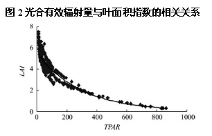 通過光合有效輻射計(jì)的研究分析,并結(jié)合表1表明,生育期內(nèi)不同處理的光合有效輻射量具有相同的變化趨勢,均呈倒拋物線形,即隨著小麥生育進(jìn)程逐漸減小,抽穗期達(dá)到最低點(diǎn),隨著成熟期小麥生長的減弱,光合有效輻射量逐漸增大,光合有效輻射量隨著播期的推遲逐漸增大,光合有效輻射量的動態(tài)變化與葉面積指數(shù)呈相反的趨勢。圖2是不同播期小麥各生育期光合有效輻射量與葉面積指數(shù)的相關(guān)關(guān)系圖,光合有效輻射量與葉面積指數(shù)負(fù)相關(guān),經(jīng)顯著性分析,為極顯著負(fù)相關(guān)。