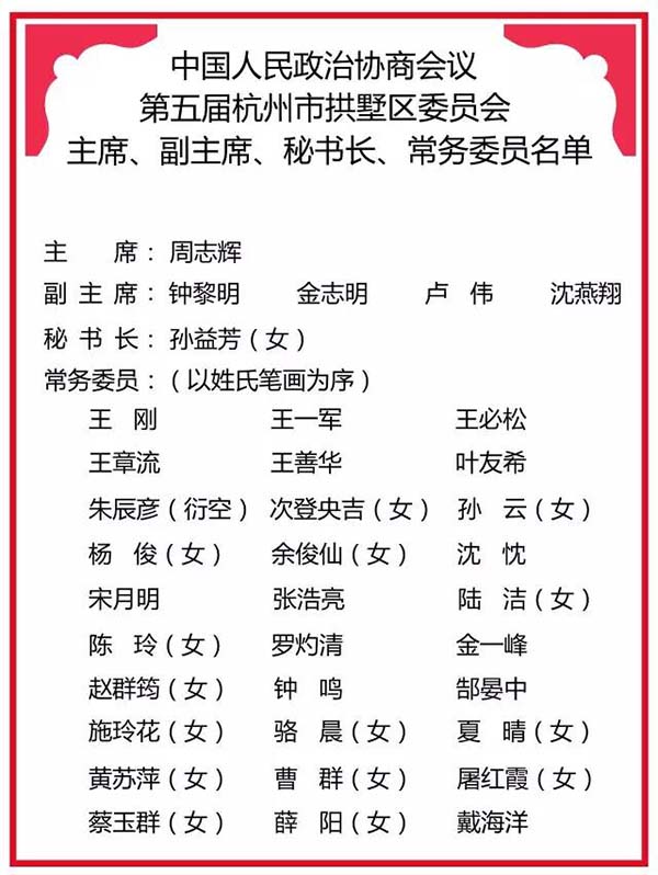 中國人民政治協(xié)商會(huì)議第五屆杭州市拱墅區(qū)委員會(huì)委員名單